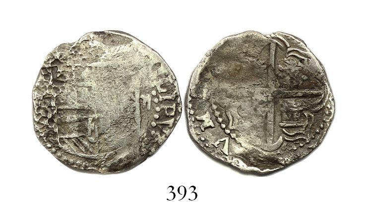 Potosi, Bolivia, cob 2 reales, Philip III, assayer Q, Grade 2. S-P17; KM-8 ;CT-353. 5.93 grams. Round flan with full but very weakly struck shield and cross, full denomination ii and most of king's name, corroded only on edge, patchy toning. With Fisher photo-certificate #4993. Recovered from: Santa Margarita, sunk in 1622 west of Key West, Florida