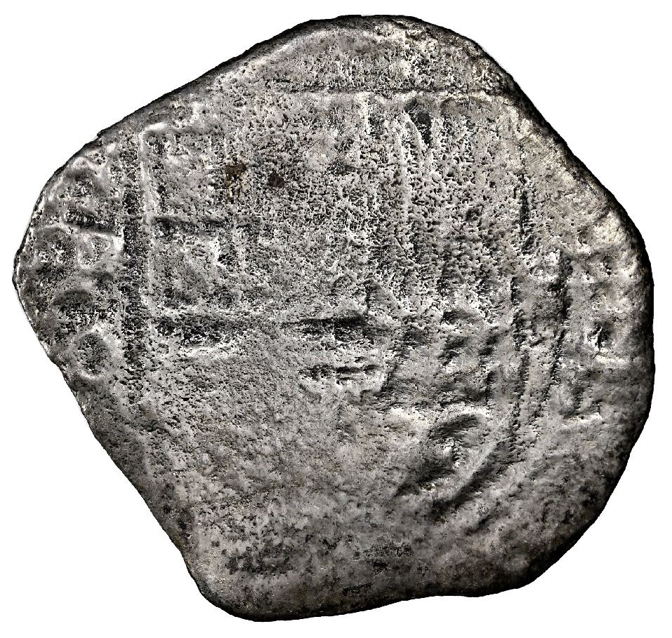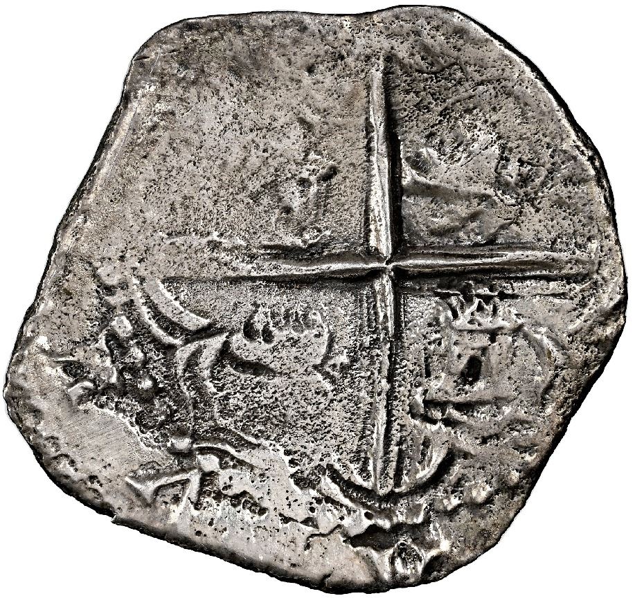 Potosi, Bolivia, cob 2 reales, Philip III, assayer Q, NGC Fine details / saltwater damage / Concepcion (Shipwreck Blue Label). S-P17; KM-8. 4.07 grams. Good full cross, weaker (corroded) full shield with bold P-Q to left, very lightly toned. Pedigreed to the 45th Anniversary Collection, with original tag 96046 and official (generic) Letter of Authenticity. Recovered from: Concepcion, sunk in 1641 off Hispaniola