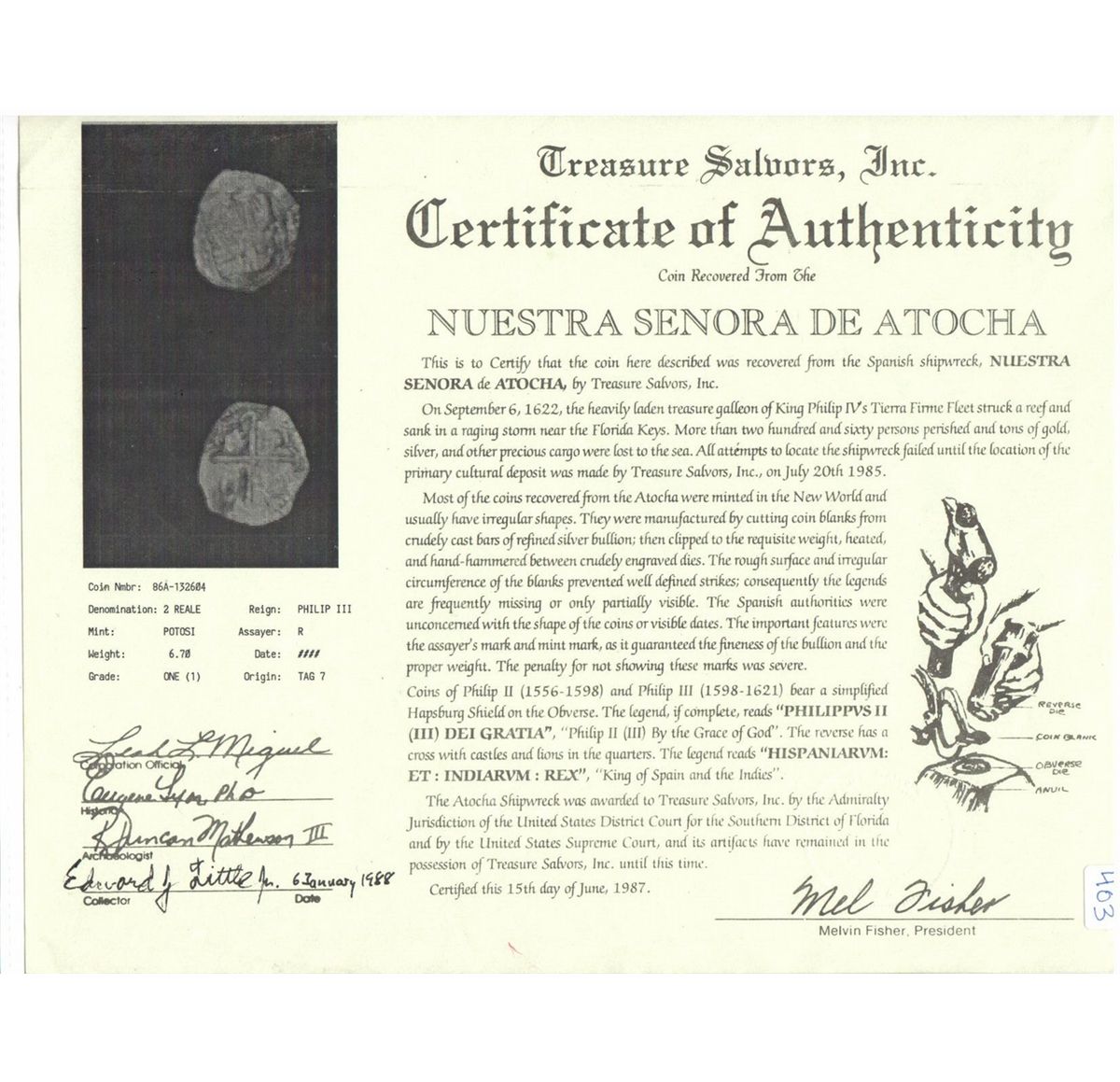 Potosi, Bolivia, cob 2 reales, Philip III, assayer R, Grade 1, with Edward J. Little signature on certificate. S-P15; KM-8. 6.7 grams. Good full cross and shield with full R to left, no corrosion, pedigreed to the cartographer who pinpointed the "mother lode" in 1985. With Fisher certificate #132604, and pedigreed to the Edward J. Little collection. Recovered from: Atocha, sunk in 1622 west of Key West, Florida