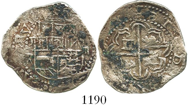 Potosi, Bolivia, cob 2 reales, Philip III, assayer R (straight leg). S-P15; KM-8. 5.7 grams. Very broad flan with well-detailed but slightly doubled full shield and cross, VF details but lightly corroded from salvage, with brown and green spots.