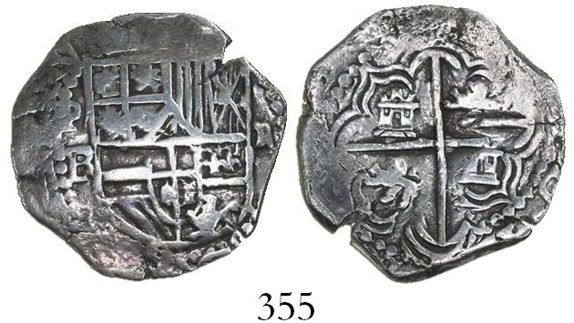 Potosi, Bolivia, cob 2 reales, Philip III, assayer RL (curved leg), Grade 1. S-P15; KM-8; CT-355. 5.79 grams. Choice full shield and cross (the latter slightly doubled), full assayer (often mistaken for B/R, per the accompanying tag and certificate), no corrosion, nicely toned. With Fisher certificate #94A-12032 and copy of Coins of the Lost Galleons booklet by Budde-Jones (2nd ed., 1993). Recovered from: Atocha, sunk in 1622 west of Key West, Florida