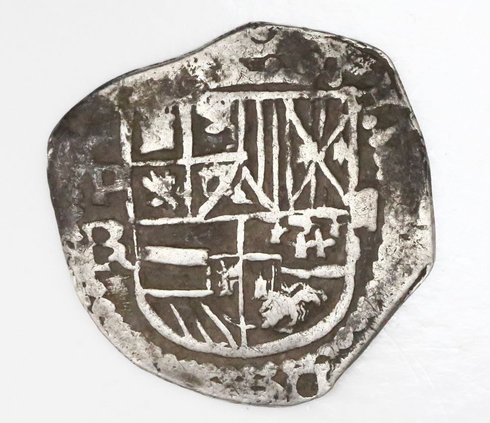 Potosi, Bolivia, cob 2 reales, Philip III, assayer RL (curved leg). S-P15; KM-8; CT-355. 6.43 grams. Bold full shield and cross, full assayer, VF with contrasting sediment around details.
