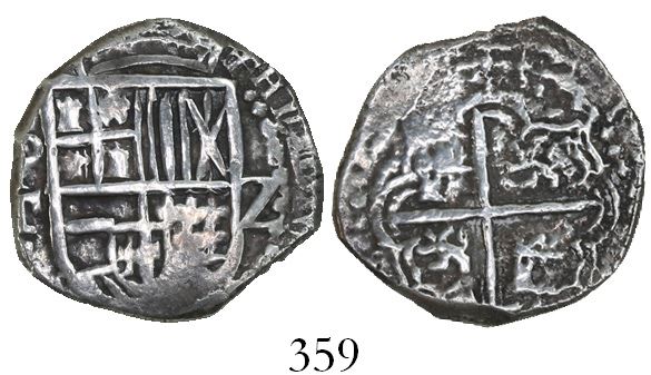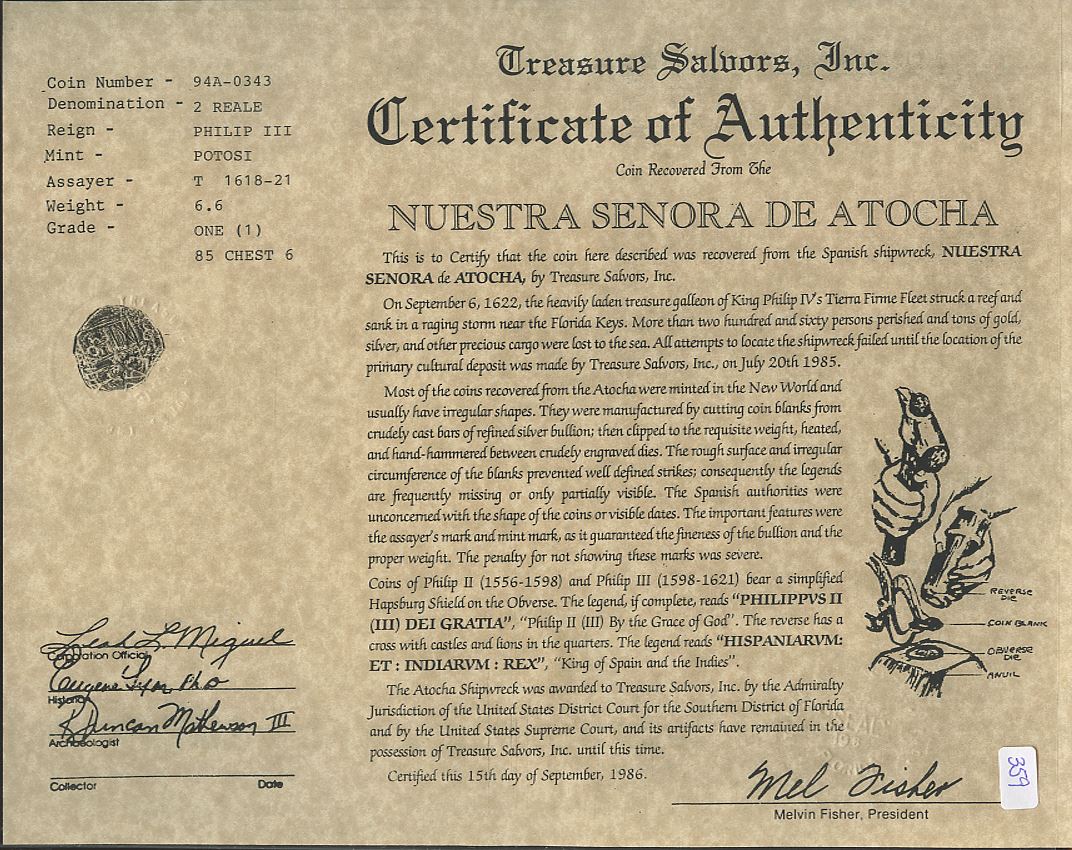 Potosi, Bolivia, cob 2 reales, Philip III, assayer T, Grade 1. S-P21; KM-8. 6.65 grams. Very bold full shield and cross and denomination, clear P-T, minimal surface corrosion, deeply contrasting toning. With Fisher certificate #94A-0343 and copy of Coins of the Lost Galleons booklet by Budde-Jones (2nd ed., 1993). Recovered from: Atocha, sunk in 1622 west of Key West, Florida