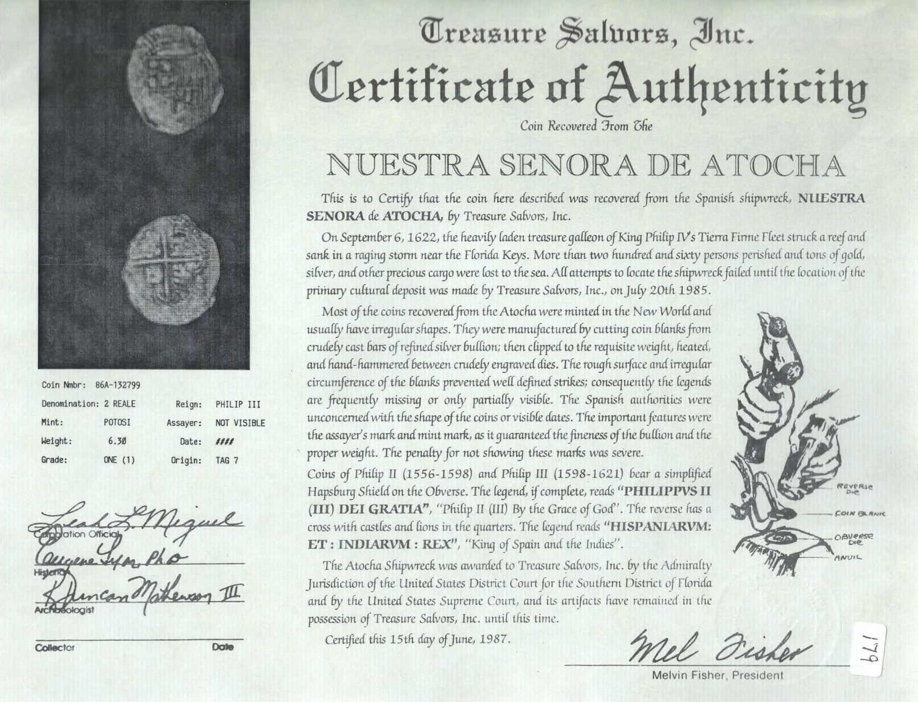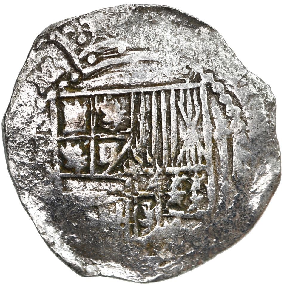 Potosi, Bolivia, cob 2 reales, Philip III, assayer not visible, Grade 1. KM-8. 6.29 grams. Bold full cross (slightly off-center) and well-detailed shield, some peripheral flatness but really no corrosion, silvery with dark toning in crevices. With original Fisher tag and certificate 86A-132799, pedigreed to the J.P. Silberman Estate.Recovered from: Atocha, sunk in 1622 west of Key West, Florida.