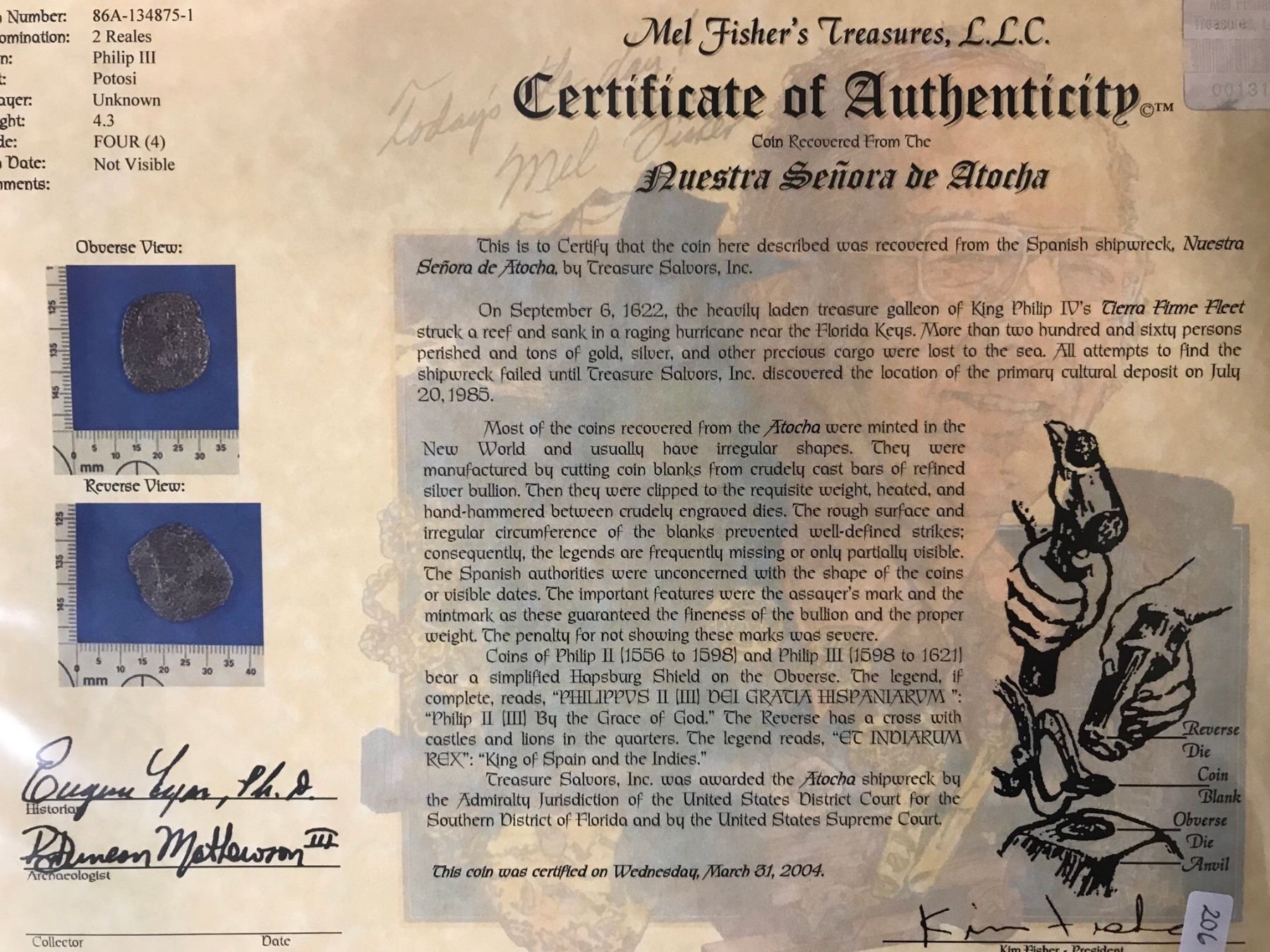 Potosi, Bolivia, cob 2 reales, Philip III, assayer not visible, Grade 4. KM-8. 4.34 grams. Decent shield, off-center cross in evidence despite heavy corrosion, darkly toned, thin. With Fisher tag and photo-certificate #134875-1. Recovered from: Atocha, sunk in 1622 west of Key West, Florida