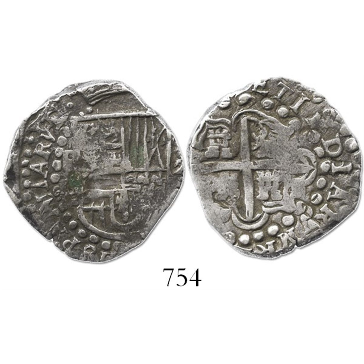 Potosi, Bolivia, cob 2 reales, Philip IV, assayer P (1620s). S-P25; KM-14a. 6.9 grams. Off-center strike on a broad flan with full shield and cross, much bold legend, nicely toned VF.