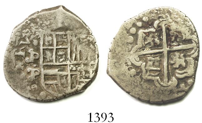 Potosi, Bolivia, cob 2 reales, Philip IV, assayer P (mid-1620s), quadrants of cross transposed. S-P23; KM-14a. 6.67 grams. Bold P-P, good full shield (off-center) and cross, Fine+ with toned fields.