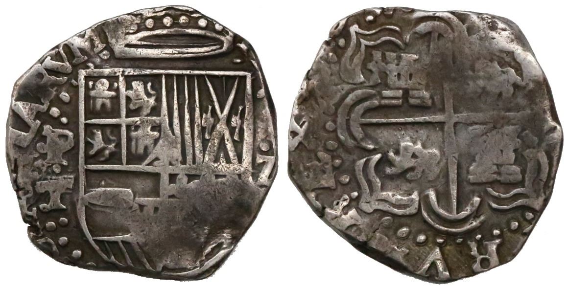 Potosi, Bolivia, cob 2 reales, Philip IV, assayer T (1630s). S-P26; KM-14a. 6.83 grams. Uneven flan with most of shield and cross and crown, full P-T, toned VF.