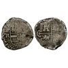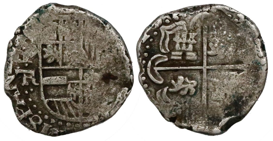 Potosi, Bolivia, cob 2 reales, Philip IV, assayer TR (1630s). S-P27; KM-14a. 7.52 grams. Bold full assayer, some cross and shield but lots of flatness, toned VF for actual wear.