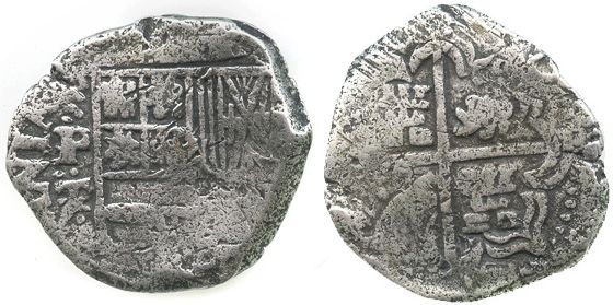 Potosi, Bolivia, cob 2 reales, Philip IV, assayer T. KM-14a. 6.7 grams. Thick and solid flan with nearly full shield and cross, bold full P-T with extra metal on the T (not an over-assayer), toned, minimal corrosion but slightly bent. Recovered from: Capitana, sunk in 1654 off Chanduy, Ecuador