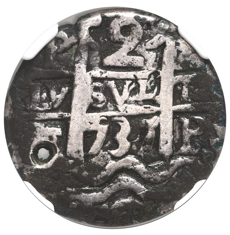 Potosi, Bolivia, cob 2 reales Royal (galano), 1737 E, very rare, NGC Fine details / holed, environmental damage. Janson-unl (R45 for type); S-P46; KM-unl; Cal-unl. 6.43 grams. Perfectly round and even flan with full interior details, holed to right of cross / 7 o'clock on pillars side, with dark oxidation at edge, first example we have ever seen or heard of for a Royal of this date. NGC #6068759-006.