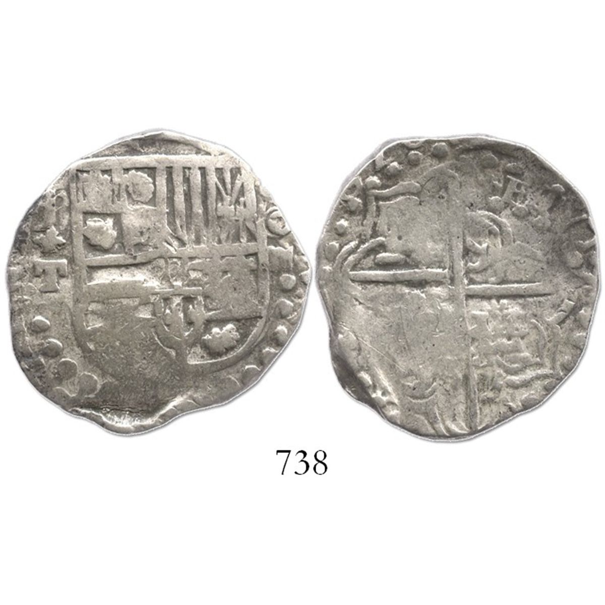 Potosi, Bolivia, cob 4 reales, (1)620T, rare. S-P21; KM-9; CT-248. 13.5 grams. Good full shield with bold P+T to left, full but somewhat weak and slightly doubled cross with clear bottoms of digits of date, Fine overall with part of edge crude (as made).