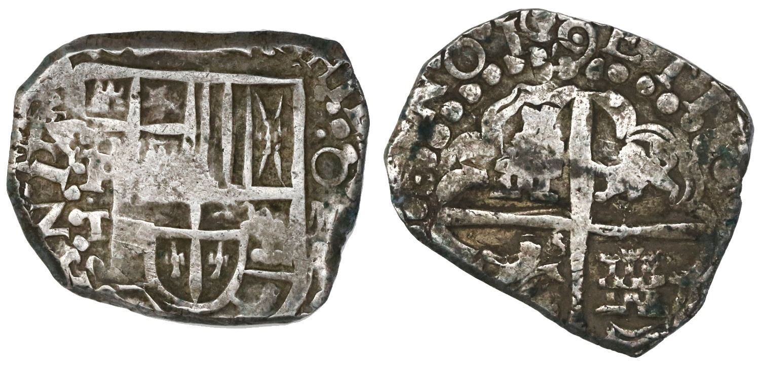 Potosi, Bolivia, cob 4 reales, 16(2)9T, rare. S-P26; KM-17a. 13.89 grams. Good but off-center cross with full date in legend that is double-struck in such a way that the 9 is on top of the 2 (Z), good full shield with clear P-dot-T to left, oddly rectangular flan, VF with brownish sediment on fields. The minors in this period are particularly difficult because the style of punches does not match the 8 reales.