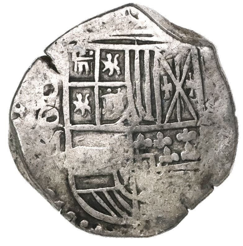 Potosi, Bolivia, cob 4 reales, 161(7)M, date at 1-2 o'clock, very rare mule with P-Q-M to left of shield. S-P19; KM-unl (9 for type); Cal-unl (Type 149). 13.18 grams. Good full cross with bold 16 of date at upper right instead of upper left, nearly full shield (well detailed but softly struck) with clear P-Q-M to left (first clear example we have seen, and only the second overall as a previous one was interpreted as P-O-M), lightly toned Fine+.