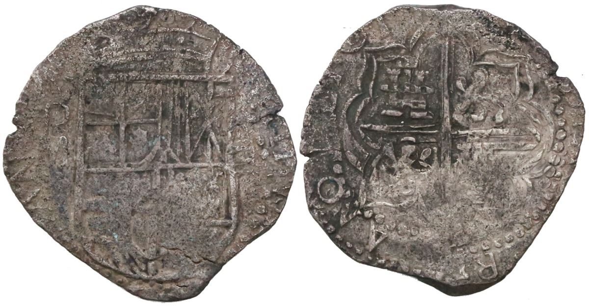 Potosi, Bolivia, cob 4 reales, 1617M. S-P19; KM-9; CT-245. 12.72 grams. Broad flan with full bottom half of date, full shield and cross (the latter partially doubled), uneven toning and light surface corrosion as from unspecified salvage.