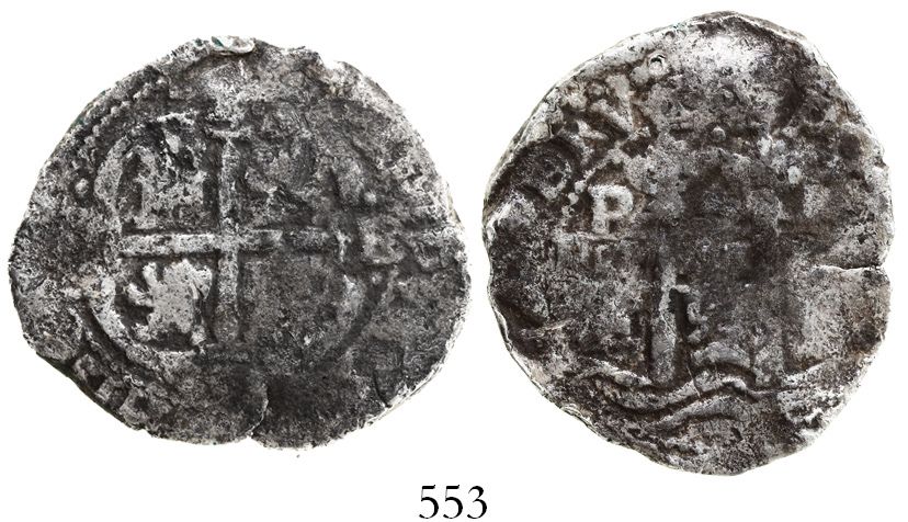 Potosi, Bolivia, cob 4 reales, 165(8-9?)E. S-P37a; KM-18. 12.88 grams. Full but crude pillars and cross, patchy toning, moderate corrosion. Recovered from: "Jupiter wreck" (San Miguel el Arcangel), sunk in 1659 off the east coast of Florida