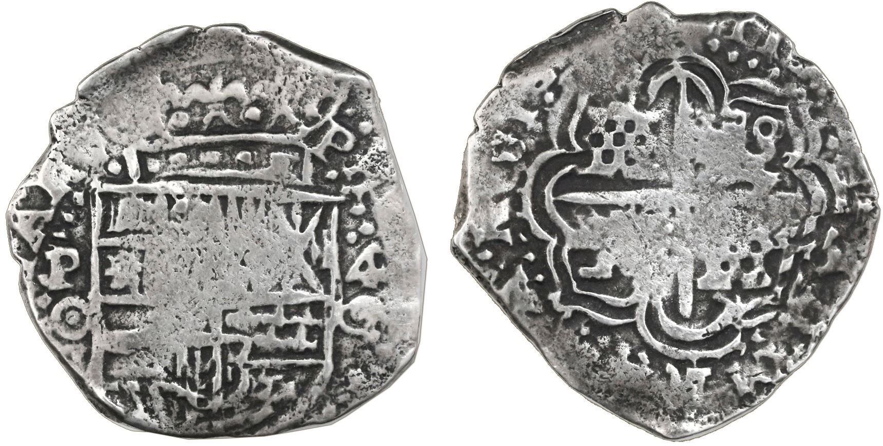 Potosi, Bolivia, cob 4 reales, (1650-1)O, no countermark (rare). S-P35; KM-17b. 10.02 grams. Good full cross-and-tressure and shield (both centrally flat), full P-O and 4-O, full crown, thin but not visibly corroded, toned in crevices. With certificate from the salvagers. Recovered from: Capitana, sunk in 1654 off Chanduy, Ecuador
