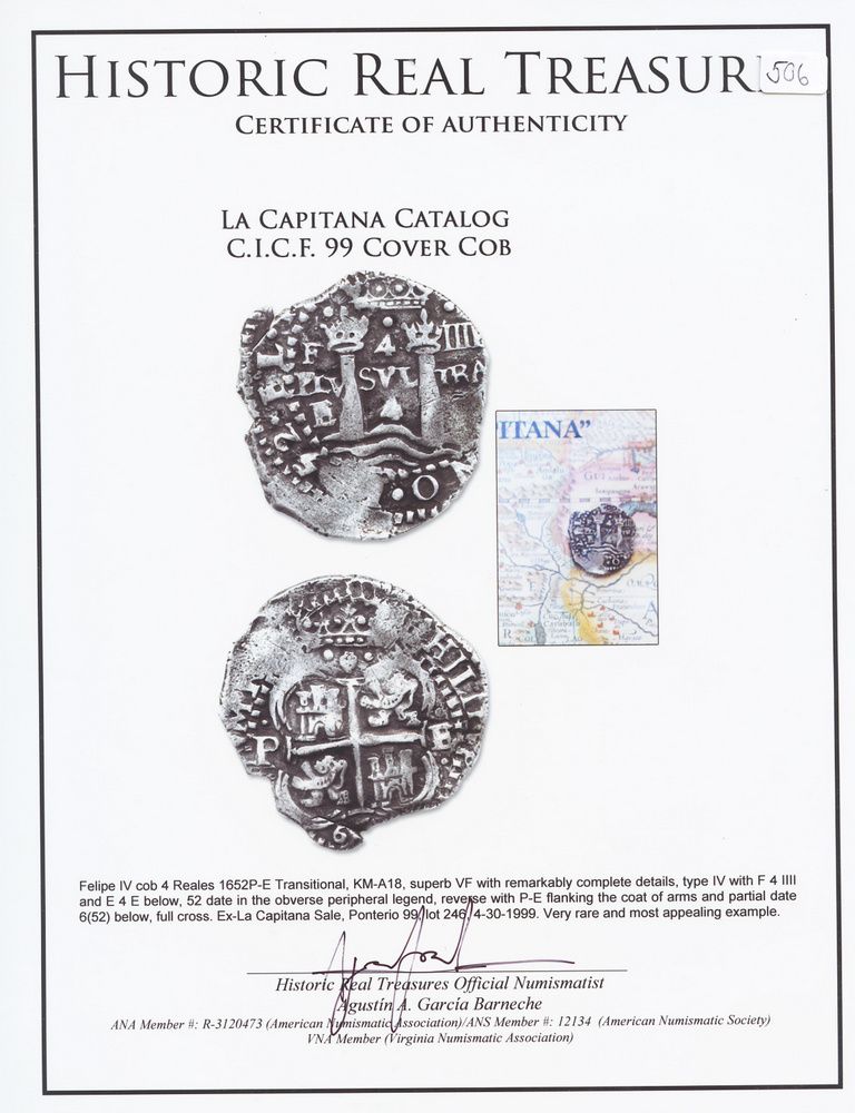 Potosi, Bolivia, cob 4 reales, 1652E Transitional, McLean Type II, very rare, Ponterio Cover Coin. S-P37; KM-B18; CT-734. 12.79 grams. Superb specimen with choice full inner details (slightly off-center), two full crowns, very bold date in legend, nicely toned and corrosion-free, and somewhat famous as appearing on the cover of the original Capitana auction by Ponterio. Pedigreed to the original Capitana auction (Ponterio, April 1999, lot #246), pictured on the cover of that catalog, with photo-certificate. Recovered from: Capitana, sunk in 1654 off Chanduy, Ecuador