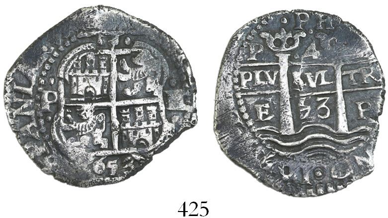 Potosi, Bolivia, cob 4 reales, 1653E, dot-PH-dot at top. S-P37a; KM-18; CT-740. 12.75 grams. Choice full pillars-and-waves and cross-lions-castles, deeply toned and well detailed, with three dates and mintmarks, no surface corrosion but possibly with small part of edge lost. Pedigreed to the Rob McClung collection. Recovered from: Capitana, sunk in 1654 off Chanduy, Ecuador