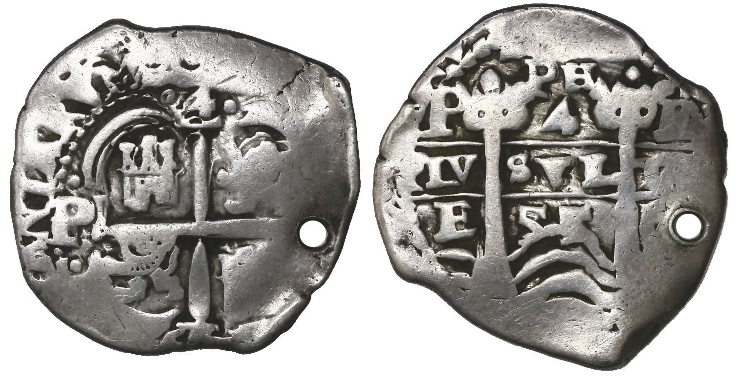 Potosi, Bolivia, cob 4 reales, 1655E, PH at top. S-P37a; KM-18; CT-743, 747. 13.16 grams. Choice full pillars and nearly full cross with dark, contrasting toning on fields, evenly struck Fine with hole to right of cross.