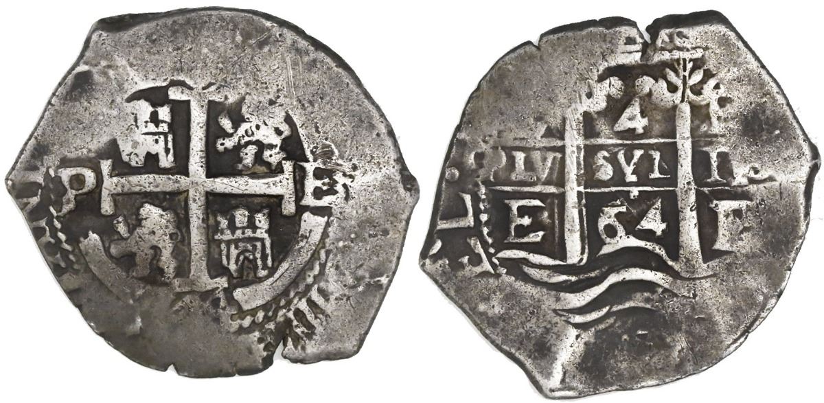 Potosi, Bolivia, cob 4 reales, 1664E. S-P37a; KM-18; CT-756. 14.10 grams. Superb full cross-lions-castles and pillars-and-waves with two dates, three mintmarks and assayers, richly toned VF+, quite attractive overall.