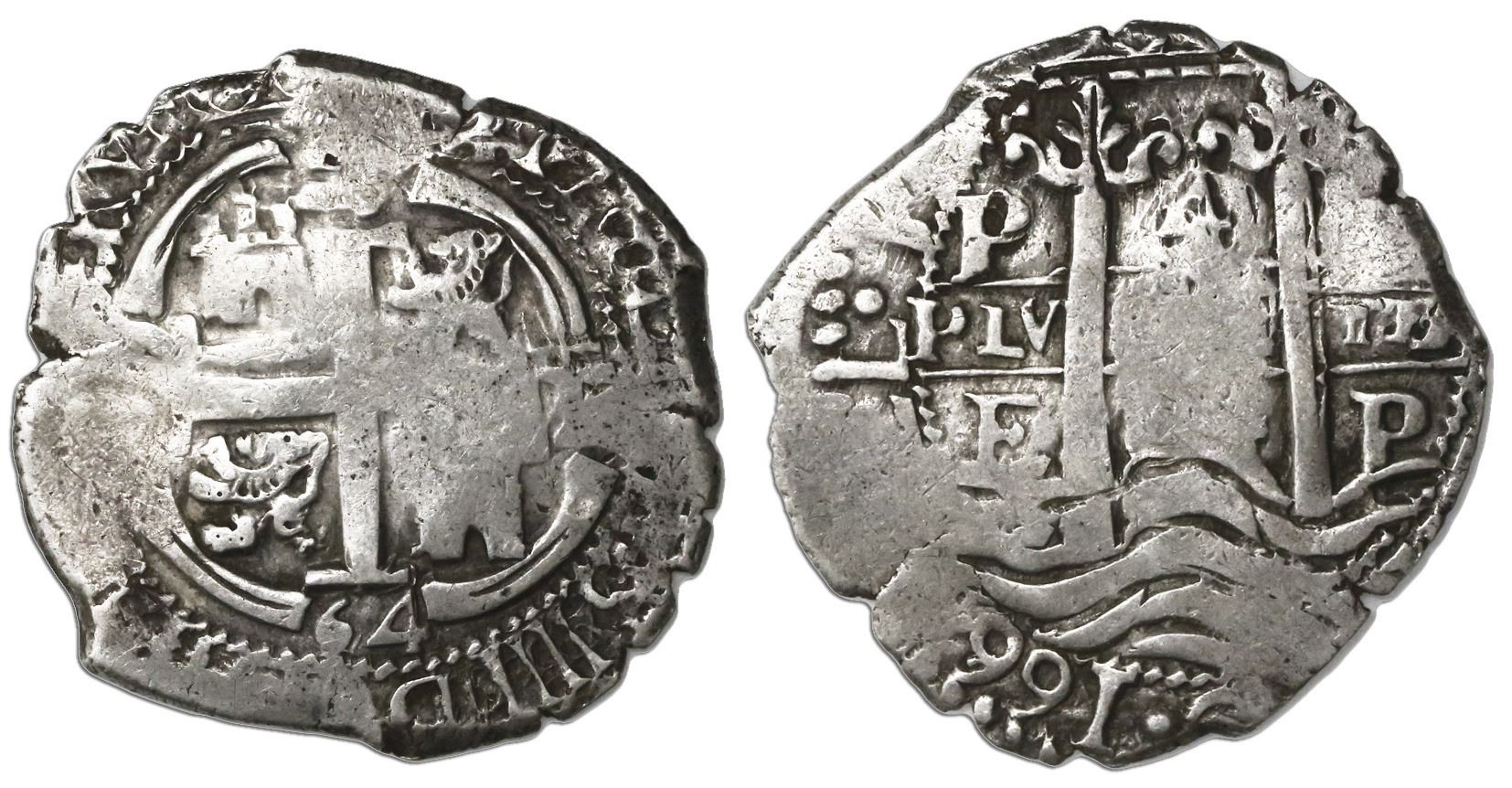 Potosi, Bolivia, cob 4 reales, 1664E. S-P37a; KM-18; CT-756. 13.56 grams. Broad flan with some bold legend including date and king's ordinal IIII, second date below cross, two bold mintmarks, 100% full pillars but centers flat, otherwise VF with toned fields.