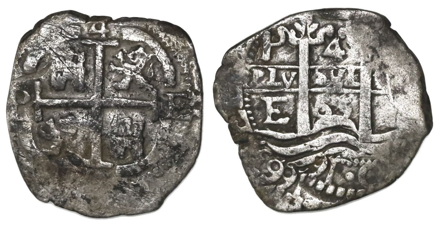 Potosi, Bolivia, cob 4 reales, 1665E. S-P37a; KM-18; CT-757. 12.33 grams. Full cross and pillars-and-waves, two dates and assayers and mintmarks, Fine+ with spotty toning, lots of old marks.