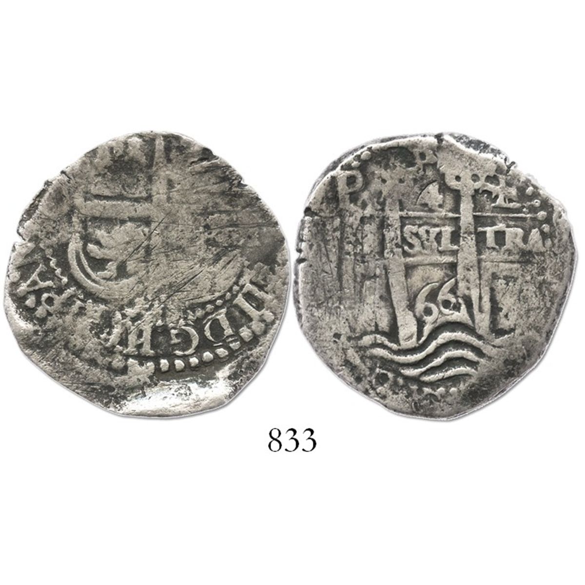 Potosi, Bolivia, cob 4 reales, 1666E. S-P37a; KM-18; CT-758. 12.9 grams. Full and bold pillars-and-waves with tooled but accurate date, weak and off-center cross with bold legend (including king's ordinal II), Fine+ with toned fields and light surface corrosion (probably salvaged).