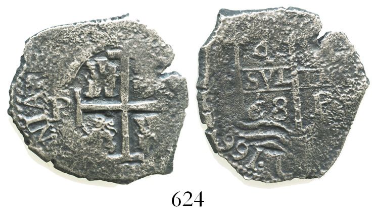 Potosi, Bolivia, cob 4 reales, 1668E. S-P37b; KM-25; CT-493. 11.0 grams. Two bold dates on pillars side, good full cross, nicely toned but typically corroded. Recovered from: Consolacion, sunk in 1681 off Santa Clara Island, Ecuador