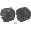 Potosi, Bolivia, cob 4 reales, 1669E. S-P37b; KM-25; CT-494. 13.2 grams. Clear date and 2 assayers but most of coin flat and without contrast (all dark), probably only light corrosion. From an Unidentified ca.-1671 wreck in Seville harbor, Spain.