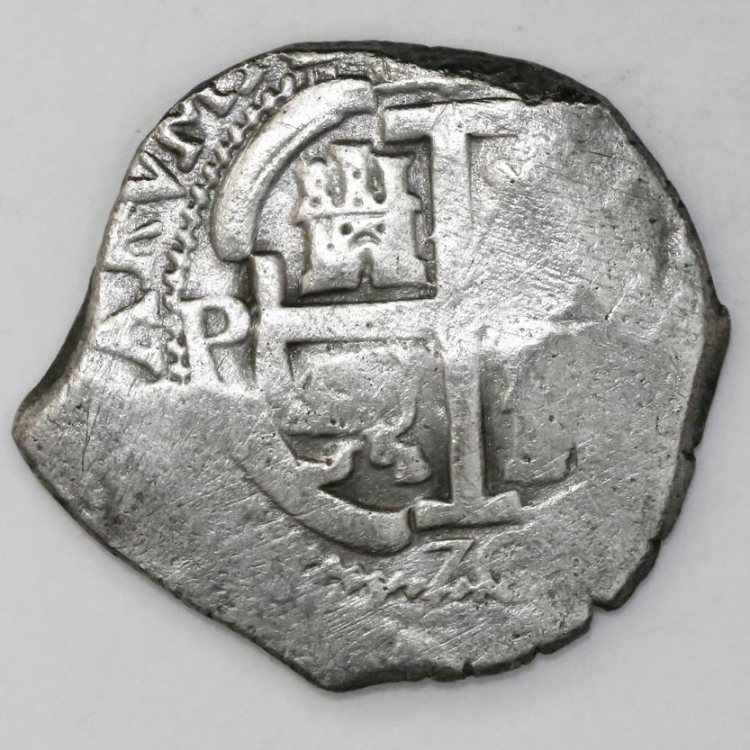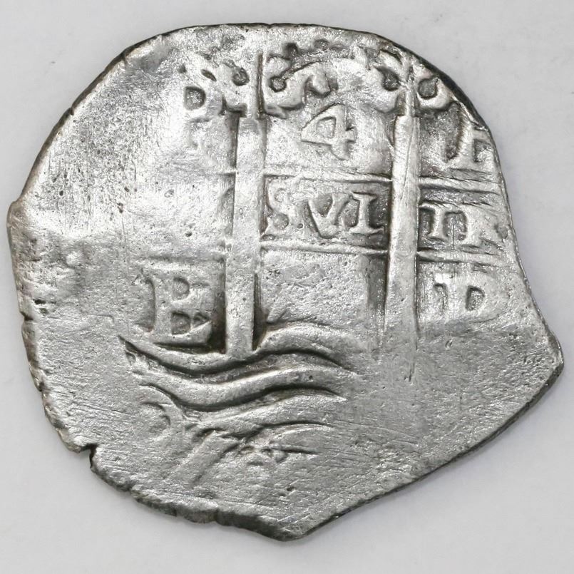 Potosi, Bolivia, cob 4 reales, 1670E. S-P37b; KM-25; CT-495. 12.40 grams. Choice, with polished but minimally corroded surfaces, nice two dates including pillars-side date in legend. Recovered from: Unidentified ca.-1671 wreck in Seville Harbor, Spain