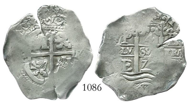 Potosi, Bolivia, cob 4 reales, 1670E. S-P37b; KM-25; CT-495. 13.0 grams. Very broad flan, good full cross and well-detailed crown, full but partially flat pillars, peripheral flatness, VF with 2 edge-splits.