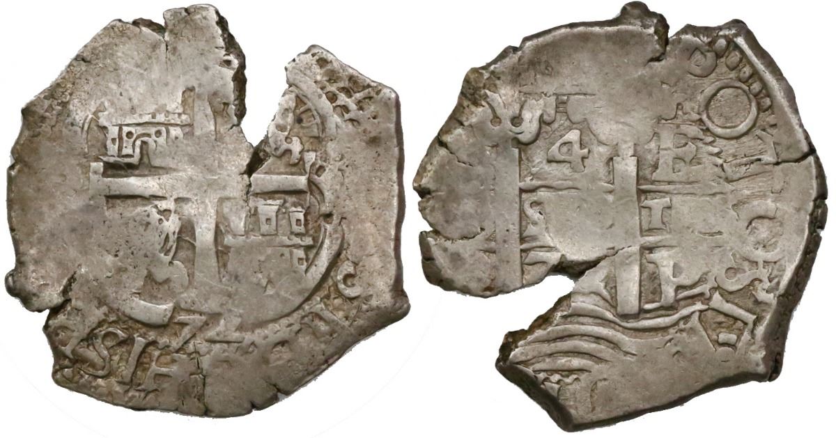 Potosi, Bolivia, cob 4 reales, 1672E. S-P37b; KM-25; CT-497. 13.05 grams. Uneven AVF with bold waves, full POTOSI, two dates, large edge-crack.