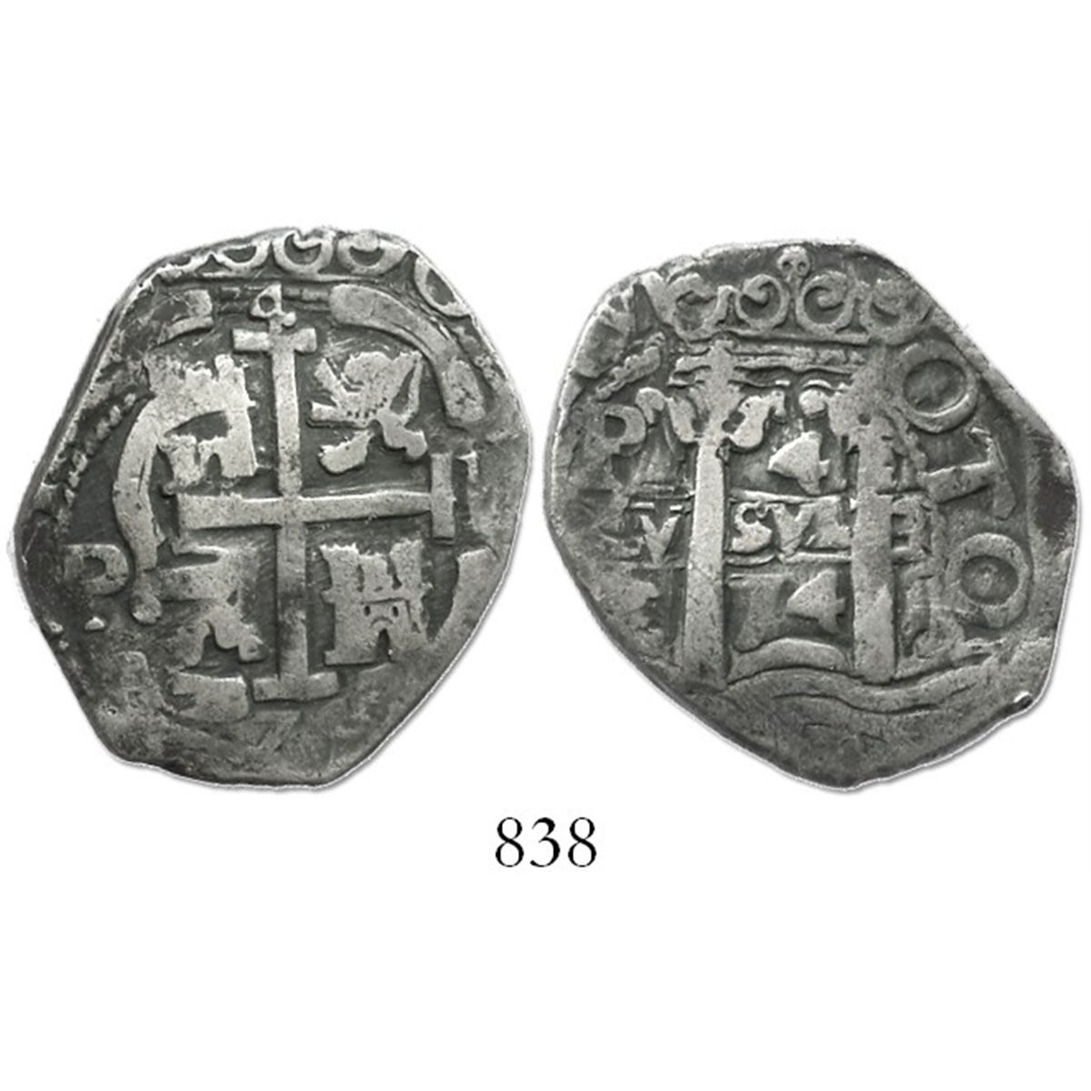 Potosi, Bolivia, cob 4 reales, 1674E, very rare. S-P37b; KM-25; CT-499. 11.1 grams. Choice full crown and pillars and cross, clear date (missing in Sellschopp and Karon, and only the second one known to us), bold POTO(SI) in legend, richly toned Fine+ with part of edge lightly shaved long ago.