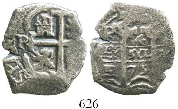 Potosi, Bolivia, cob 4 reales, 1675E. S-P37b; KM-25; CT-500. 8.3 grams. Small flan from corrosion but with bold full pillars and good but incomplete cross, clear date, 2 mintmarks, nicely toned. Recovered from: Consolacion, sunk in 1681 off Santa Clara Island, Ecuador