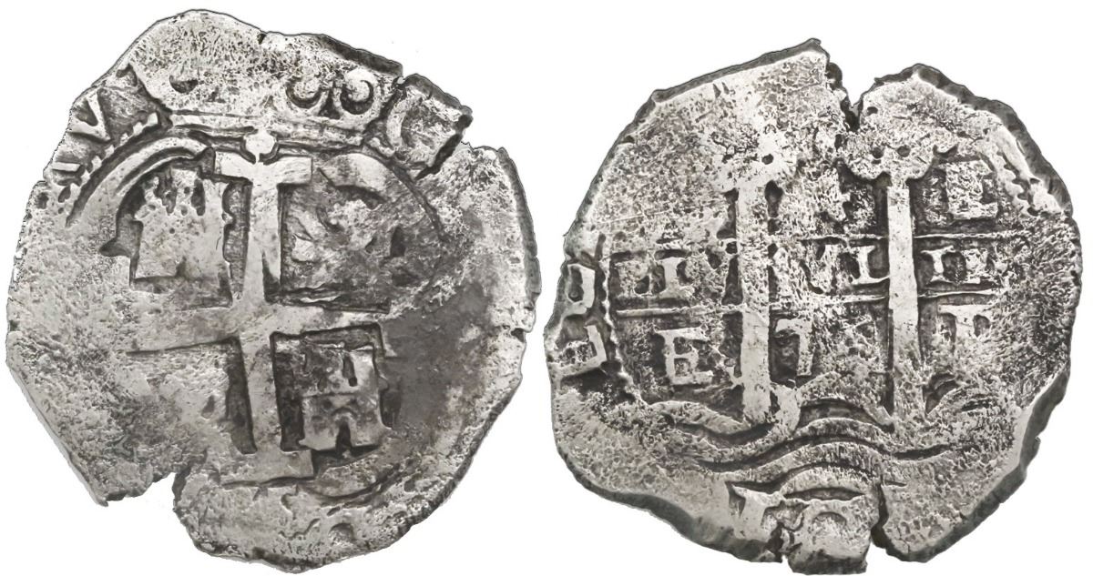 Potosi, Bolivia, cob 4 reales, 1675E. S-P37b; KM-25; CT-500. 13.16 grams. Full and well-centered pillars-and-waves, nearly full but slightly doubled cross, weak date, no corrosion but some flatness, large patch of copper color on cross side. Recovered from: Piedmont, sunk in 1795 off Dorset, England