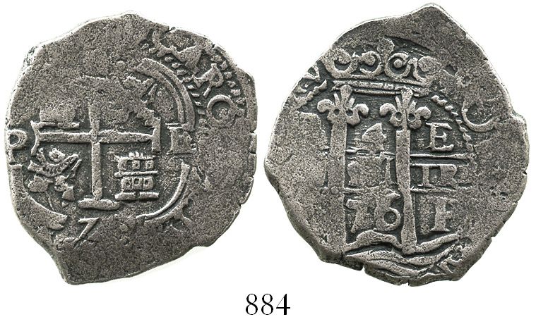 Potosi, Bolivia, cob 4 reales, 1676E. S-P37b; KM-25; CT-501. 13.3 grams. Choice specimen with great full pillars and crown, full cross (just a flat spot at top), part of king's name, 2 dates, nicely toned and corrosion-free. Recovered from: Piedmont, sunk in 1795 off Cornwall, England