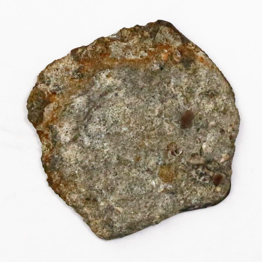 Potosi, Bolivia, cob 4 reales, 1678E, encrusted as found. S-P37b; KM-25; CT-503. 9.86 grams. Minimal details due to corrosion and gray encrustation (with some orange) that totally covers the cross side and is pulled back just enough on pillars side to see the date. Recovered from: Consolacion, sunk in 1681 off Santa Clara Island, Ecuador