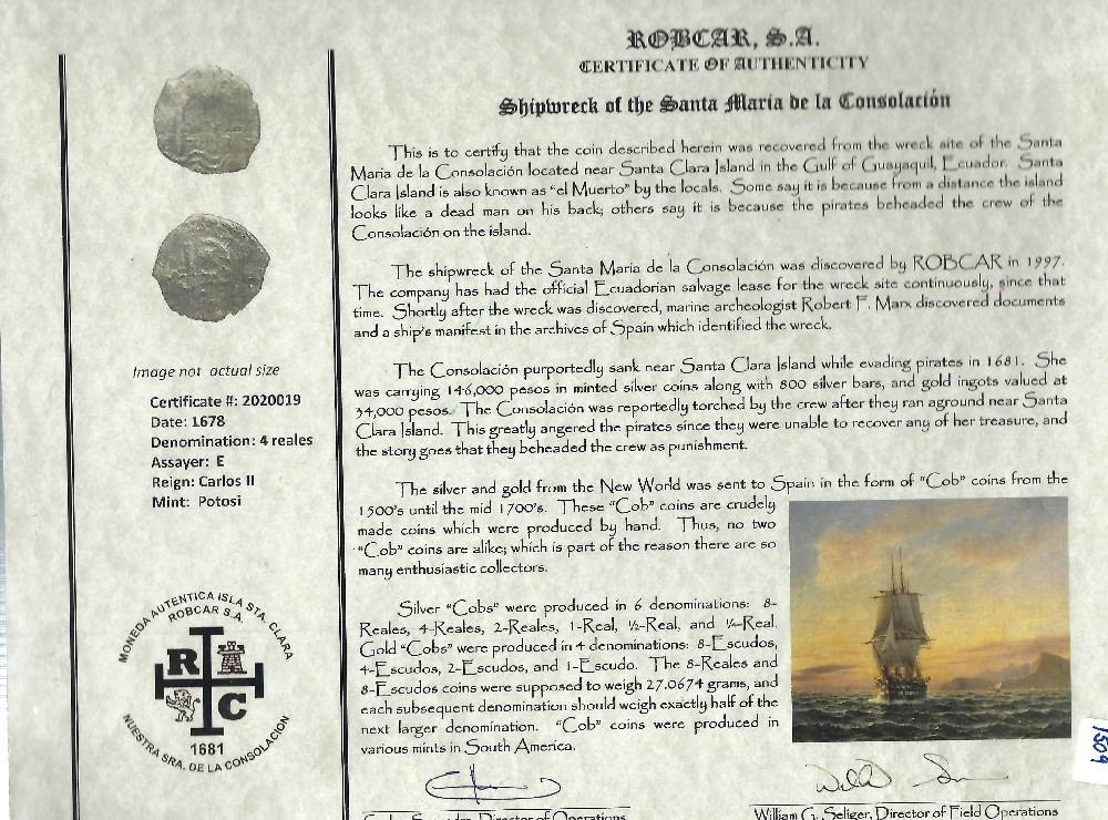 Potosi, Bolivia, cob 4 reales, 1678E. S-P37b; KM-25; Cal-522. 9.40 grams. Darkly colored and corroded with some horn silver, weak cross side but clear date and assayer on the pillars side. With ROBCAR tag and photo-certificate #2020019. From: Consolacion, sunk in 1681 off Santa Clara Island, Ecuador
