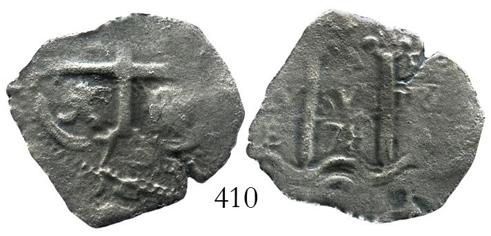 Potosi, Bolivia, cob 4 reales, 1678E. S-P37b; KM-25; CT-503. 4.2 grams. Very thin from corrosion but with bold full pillars and 2 dates. With photo-certificate. Recovered from: Consolacion, sunk in 1681 off Ecuador