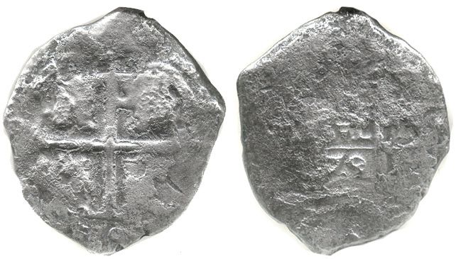 Potosi, Bolivia, cob 4 reales, 1679(V), encapsulated ANACS G 4, with name of wreck stated in slab. S-P39; KM-25; CT-506. Full and well-centered cross, 2 bold dates, but crudely corroded. Recovered from: Consolacion, sunk in 1681 off Santa Clara Island, Ecuador