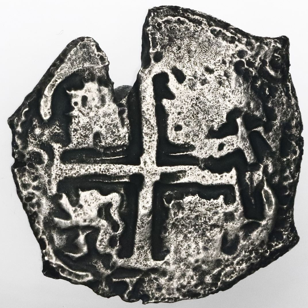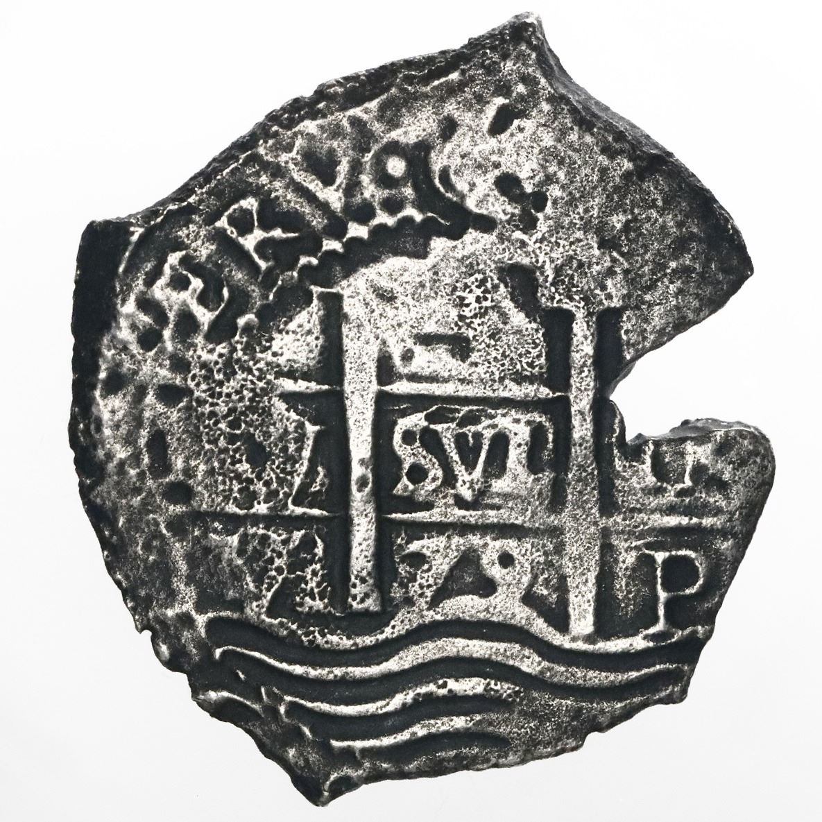 Potosi, Bolivia, cob 4 reales, 1679V, ex-Consolacion (1681). S-P39; KM-25; Cal-524. 9.16 grams. Somewhat corroded with parts of edges thin yet still well detailed with full pillars-and-waves and bold cross (slightly doubled), wide edge-crack. Pedigreed to the Arturo Rosenheim collection and from the Consolacion (1681).