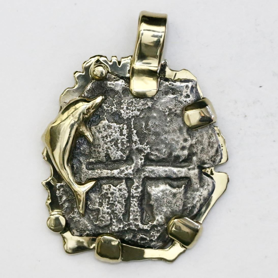 Potosi, Bolivia, cob 4 reales, 1679V, from the Consolacion (1681), mounted cross-side out in artistic 14K gold bezel with dolphin embellishment. 15.18 grams total. Interesting bezel made to match the coin's shape with added dolphin to left, coin surfaces corroded with partial cross and shield, full date and mintmark by pillars noted. From the Consolacion (1681), with ROBCAR photo-certificate #440212.
