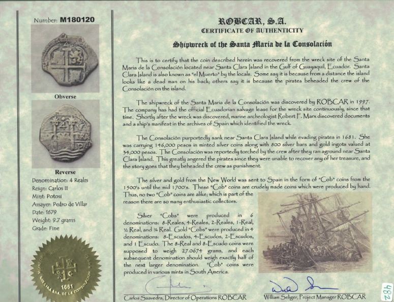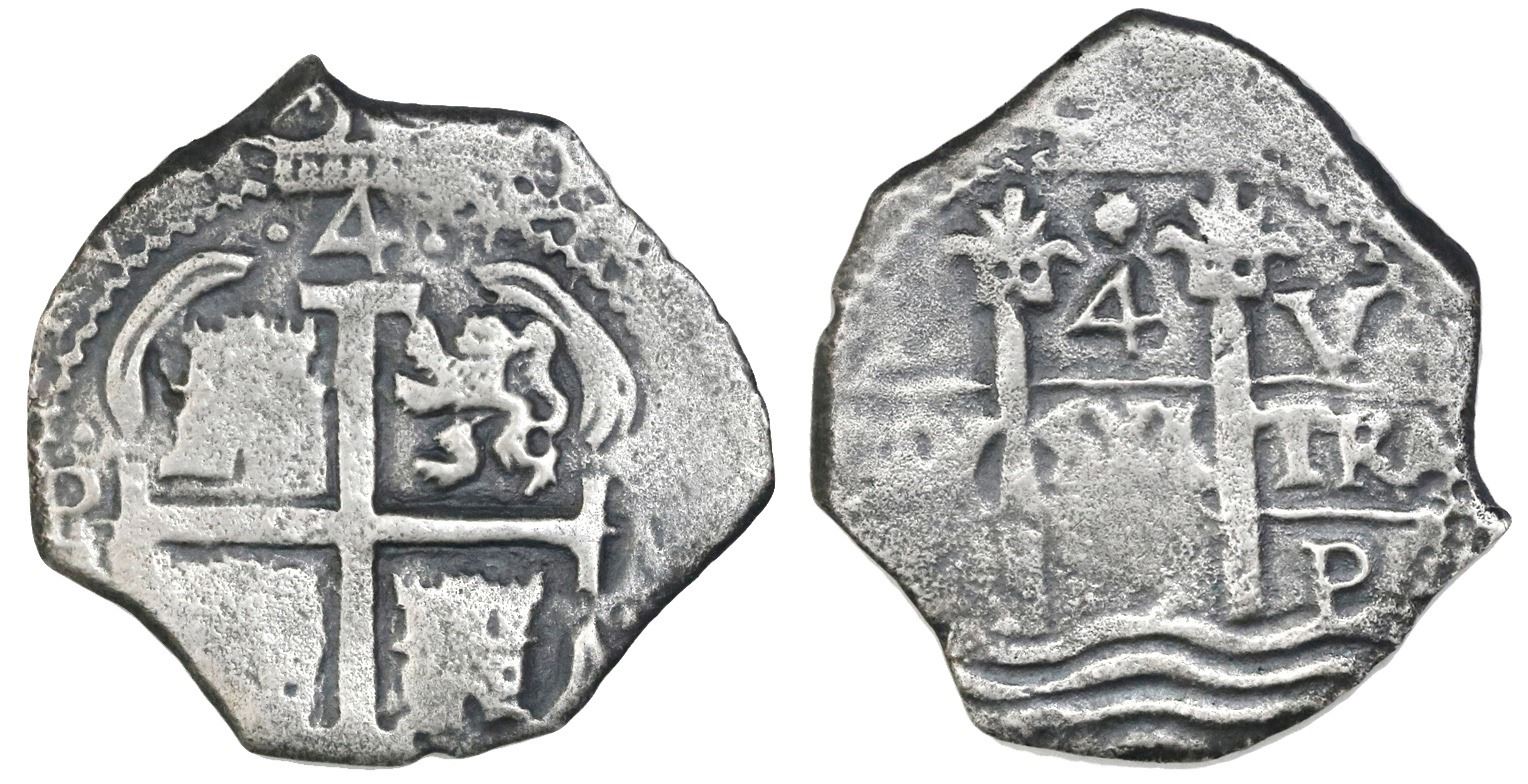 Potosi, Bolivia, cob 4 reales, 1679V. S-P39; KM-25; CT-506. 9.72 grams. Choice full pillars-and-waves and cross (the latter off-center), thin from corrosion but not so pitted as most, nicely toned. With ROBCAR photo-certificate #M180120. Recovered from: Consolacion, sunk in 1681 off Santa Clara Island, Ecuador
