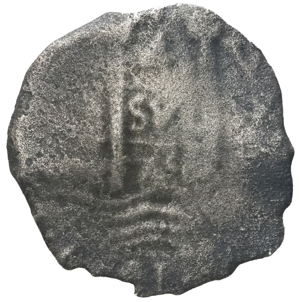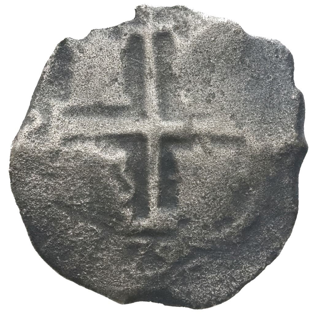 Potosi, Bolivia, cob 4 reales, 1679V. S-P39; KM-25; Cal-524. 7.64 grams. Thin edges from corrosion with weak but visible pillars and cross details including parts of all three dates, dark gray tone. With ROBCAR tag and photo-certificate #2020006. From: Consolacion, sunk in 1681 off Santa Clara Island, Ecuador