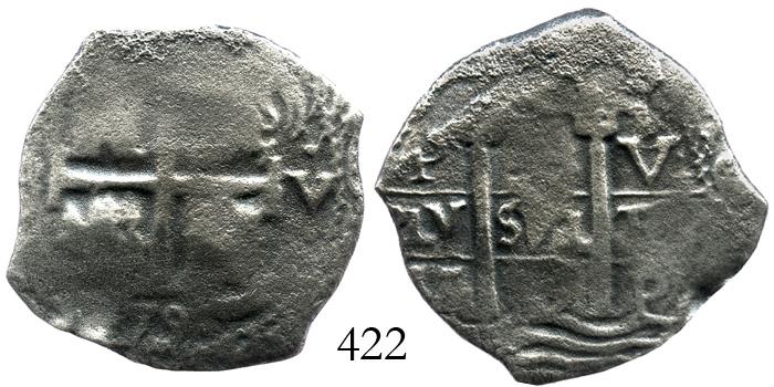 Potosi, Bolivia, cob 4 reales, 1679V. S-P39; KM-25; CT-506. 9.1 grams. Full but partially flat pillars and cross, 3 assayers, thin from corrosion. With ROBCAR certificate #M090300. Recovered from: Consolacion, sunk in 1681 off Ecuador