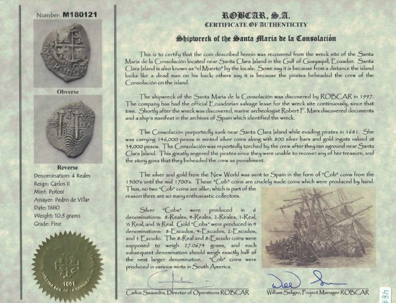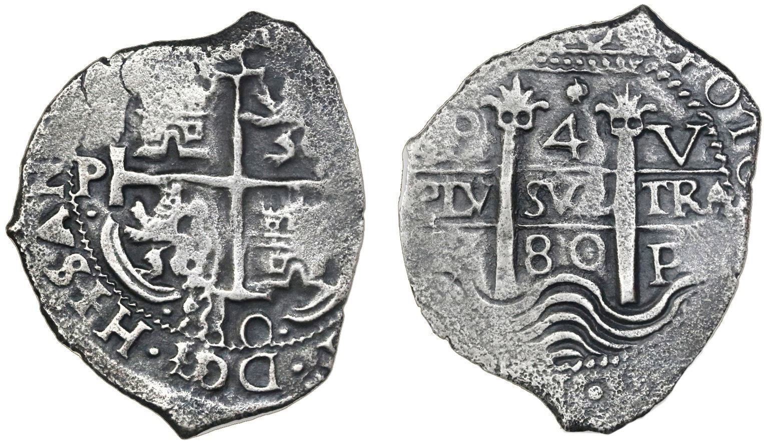 Potosi, Bolivia, cob 4 reales, 1680V. S-P39; KM-25; CT-507. 10.37 grams. Very choice full pillars-and-waves and cross-lions-castles, two dates and assayer, three mintmarks, still somewhat thin but nowhere near the usual amount of corrosion, also lovely toning, a real shipwreck gem. With ROBCAR photo-certificate #M180121. Recovered from: Consolacion, sunk in 1681 off Santa Clara Island, Ecuador