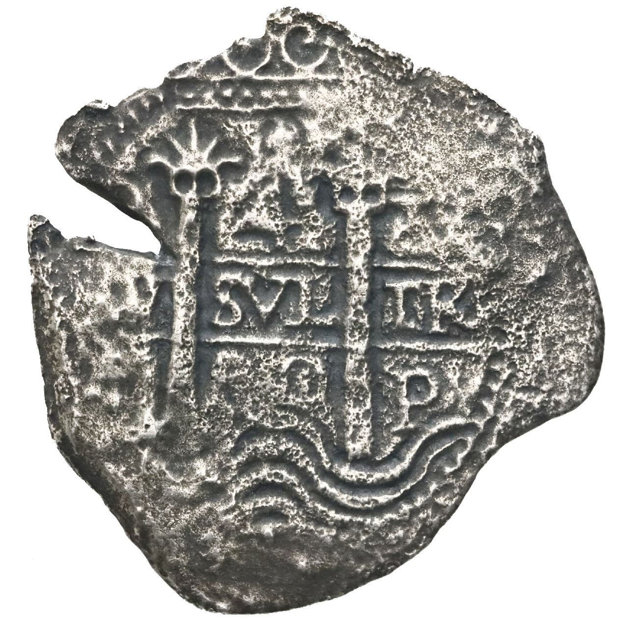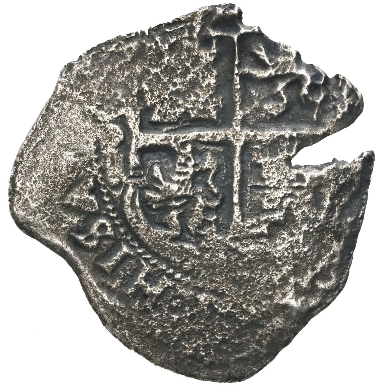 Potosi, Bolivia, cob 4 reales, 1680V. S-P39; KM-25; Cal-525. 9.10 grams. Corroded and a bit thin on the edges but nicely detailed with full pillars and nearly complete cross, natural edge crack. Pedigreed to the Arturo Rosenheim collection. From: Consolacion, sunk in 1681 off Santa Clara Island, Ecuador
