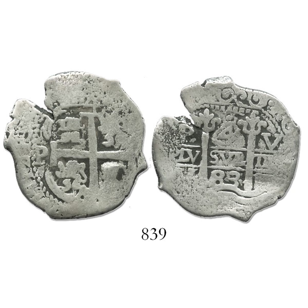 Potosi, Bolivia, cob 4 reales, 1683V. S-P39; KM-25; CT-510. 10.3 grams. Full and well-centered pillars, good full cross, contrasting toning, edge-split, Fine for wear but with light surface corrosion (salvaged), scarce date.