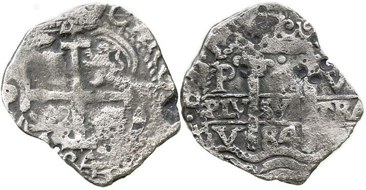 Potosi, Bolivia, cob 4 reales, 1684V. S-P39; KM-25; CT-511. 7.1 grams. Full but weak pillars-and-waves and cross, 3 assayers, clear king's name, moderate surface corrosion but with nicely contrasting toning. Recovered from: Princess Louisa, sunk in 1743 off the Cape Verde Islands, west of Africa